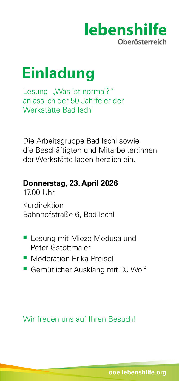 Die Arbeitsgruppe Bad Ischl sowie die Beschäftigten und Mitarbeiter:innen der Werkstätte laden herzlich ein.