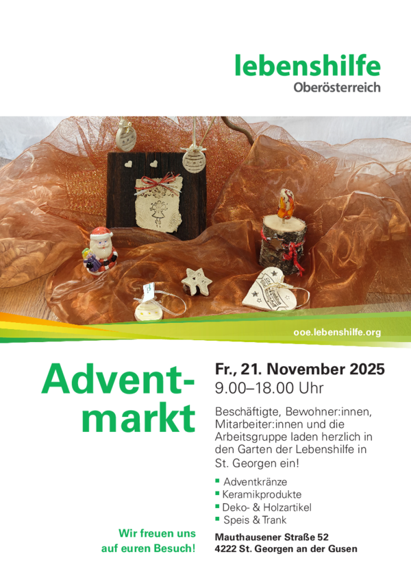 Beschäftigte und Mitarbeiter:innen der Werkstätte St. Georgen Mauthausener Straße laden zum Adventsmarkt ein!