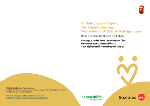 Das Land Oberösterreich veranstaltet am 6.März 2026 gemeinsam mit der Lebenshilfe eine Tagung für Angehörige von Menschen mit Beeinträchtigungen. Im Fokus der Tagung steht der Austausch zur Inklusion und Teilhabe von Menschen mit Beeinträchtigungen und der damit einhergehenden möglichen Veränderungen