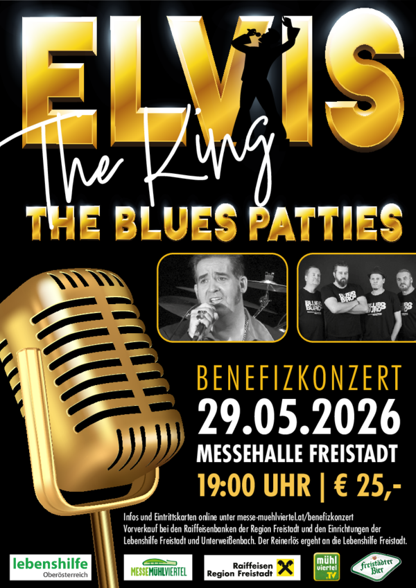 Am 29. Mai 2026 erwartet Musikbegeisterte in der Messehalle Freistadt 2 ein besonderes Highlight: Die Arbeitsgruppe der Lebenshilfe Oberösterreich in Freistadt und die Messe Freistadt laden zum Benefizkonzert „ELVIS – The King & The Blues Patties“. Tickets sind bereits erhältlich, der Erlös kommt der Lebenshilfe in Freistadt zugute.