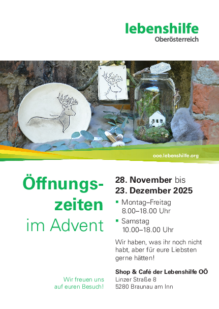 Gemütliches Stöbern und Advent-Atmosphäre im Shop & Café der Werkstätte Braunau. In der Adventzeit mit erweiterten Öffnungszeiten.